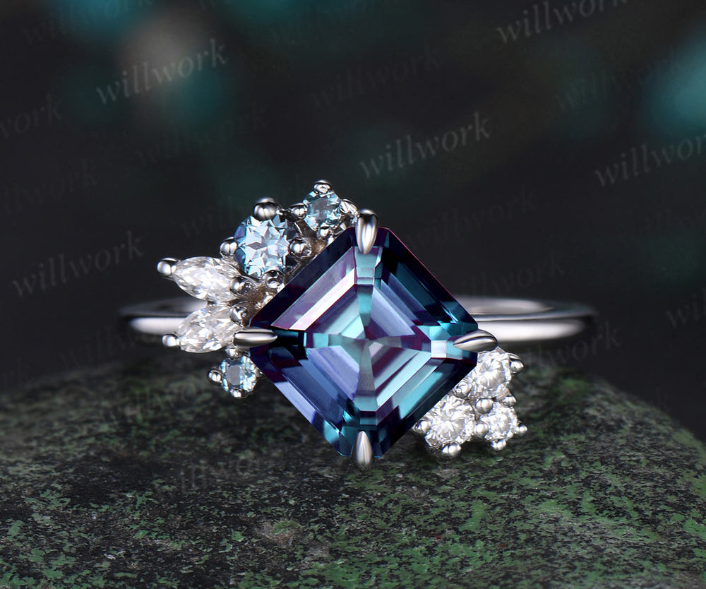 Asscher cut alexandrite engagement ring white gold cluster diamond promise wedding ring women color change gemstone ring