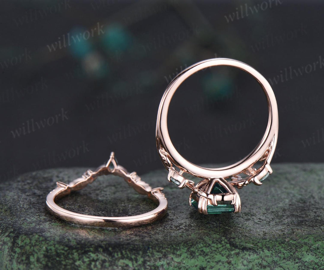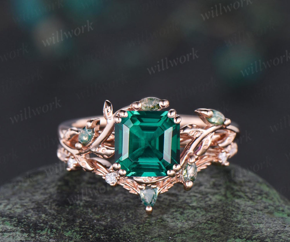 Asscher cut green emerald leaf engagement ring set art deco 14k rose gold cluster nature inspired moss agate bridal ring set women gift