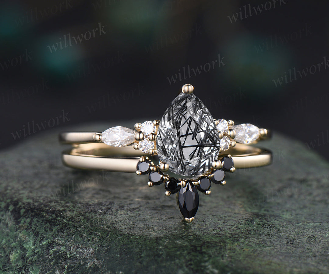 READY TO SHIP: Peardrop Black Rutilated Quartz Engagement Ring Set - Sterling Silver - Ring Size: 6 US