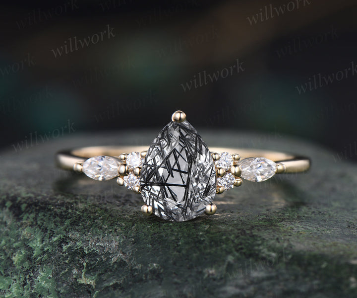 - Main Stone: 6x8mm pear cut natural black rutilated quartz