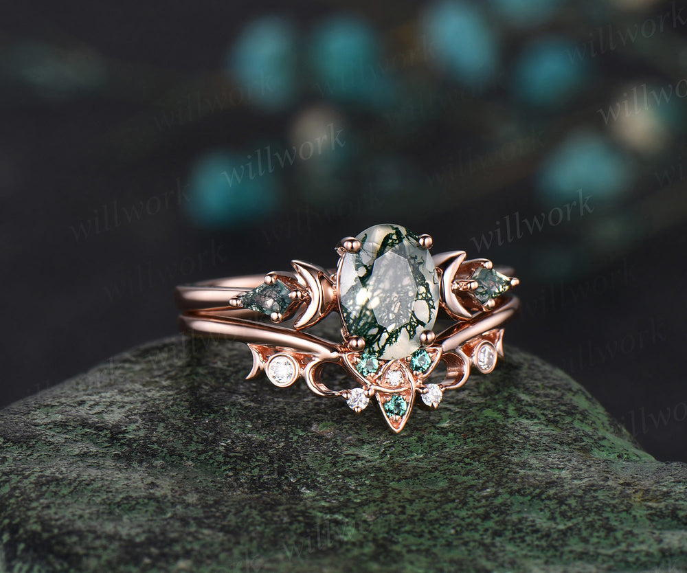 Oval cut moss agate promise ring Celtic knot moon three stone engagement ring set women kite wedding ring women