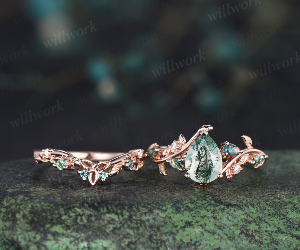 Pear cut moss agate engagement ring rose gold leaf celtic knot wedding ring set nature inspired jewelry