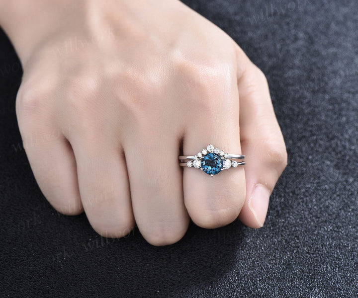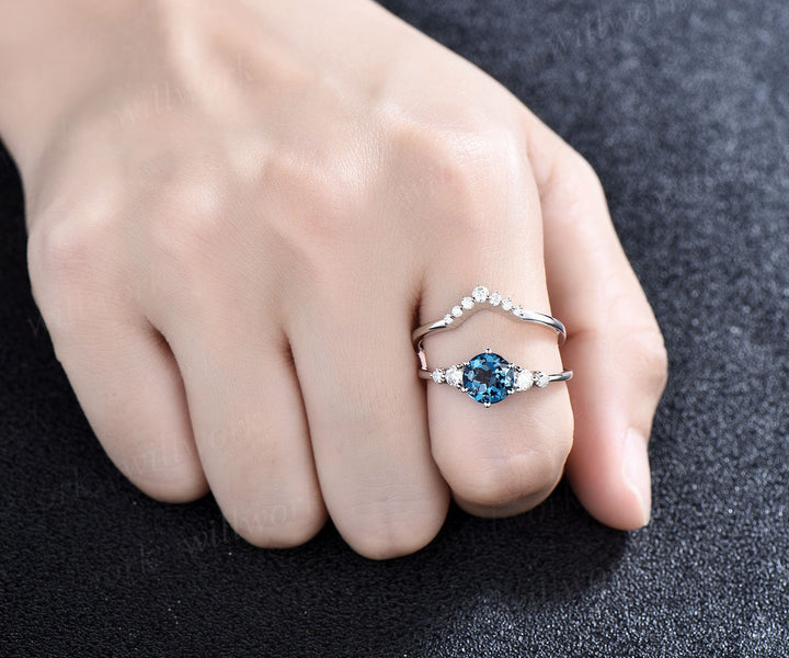 Unique London blue topaz engagement ring set 14k rose gold silver five stone minimalist ring six prong moissanite bridal ring set for women