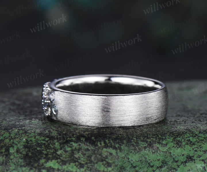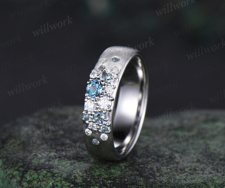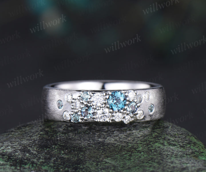 Alexandrite moissanite cluster men's wedding band unique brushed solid 14k white gold 6mm engagement ring for men anniversary gifts