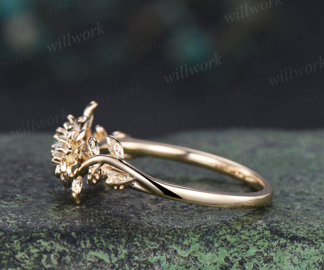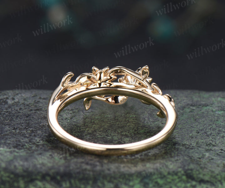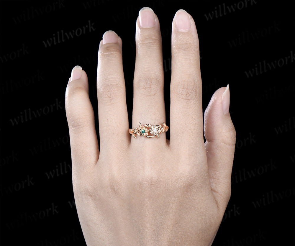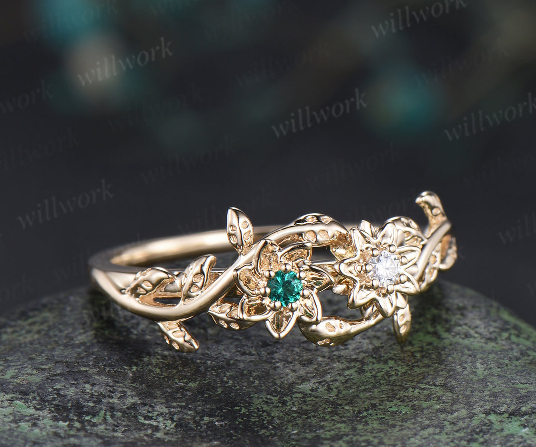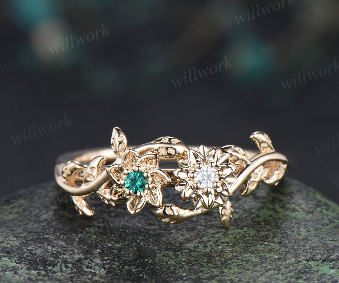Dainty flower emerald moissanite ring twig leaf vine engagement ring Toi et moi promise ring for women gifts for her