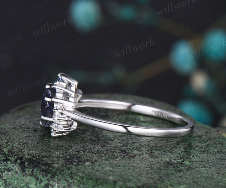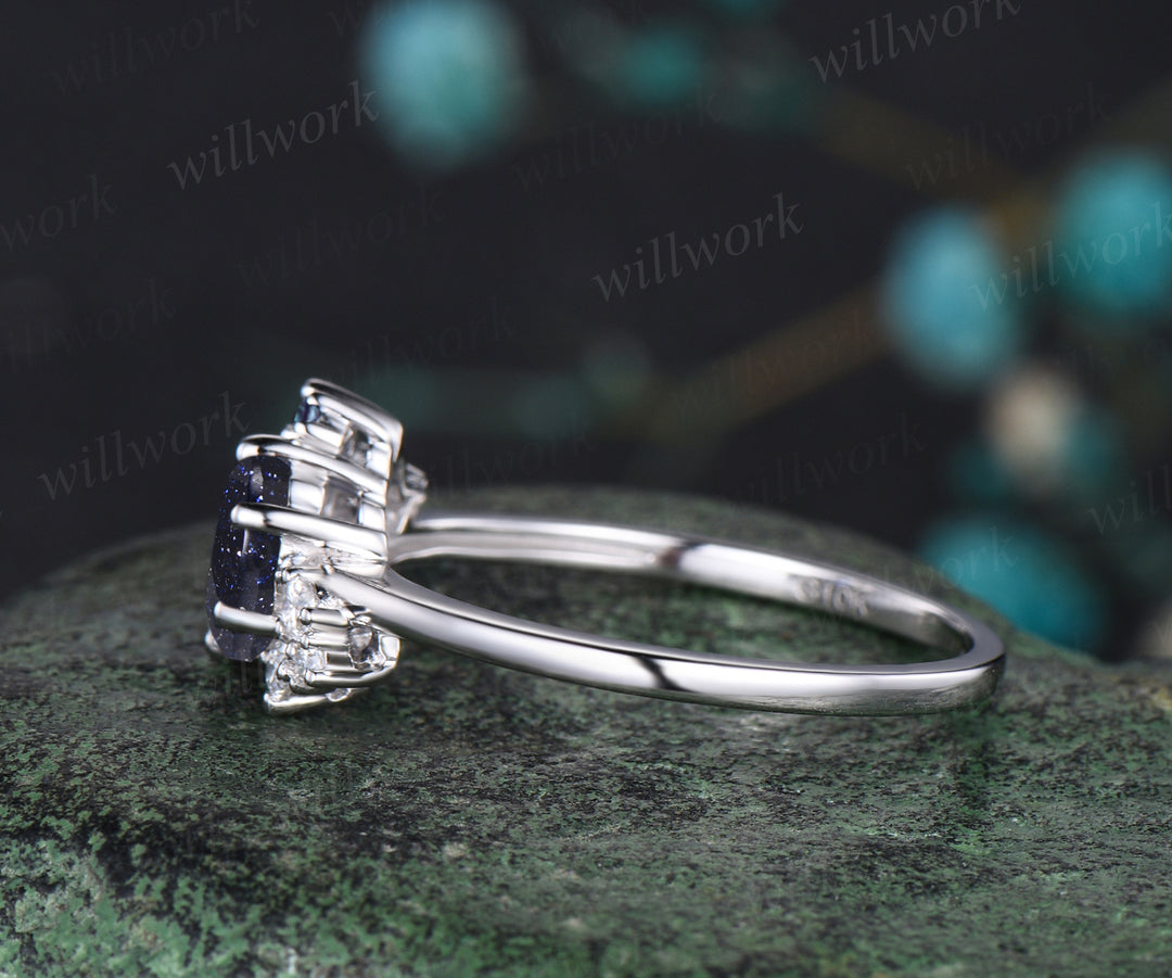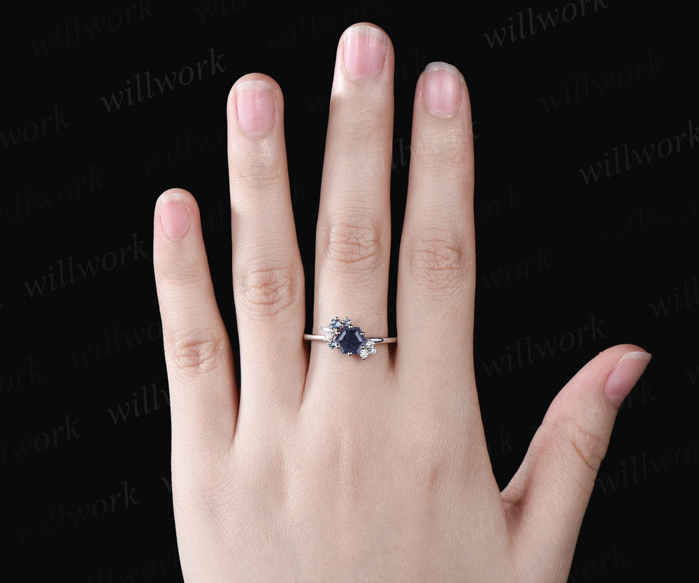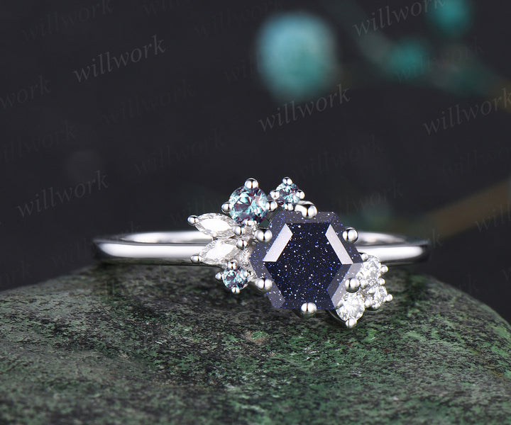 Galaxy Hexagon Cut Blue Sandstone Engagement Ring Moissanite Diamond Alexandrite Cluster Wedding Ring 14k White Gold Healing Jewelry