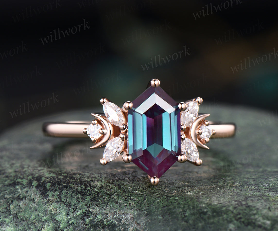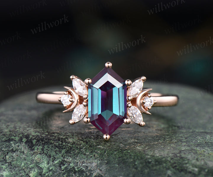 Hexagon cut alexandrite engagement ring unique art deco moissanite ring moon 14k rose gold 7 stones ring June birthstone proposal wedding ring for women