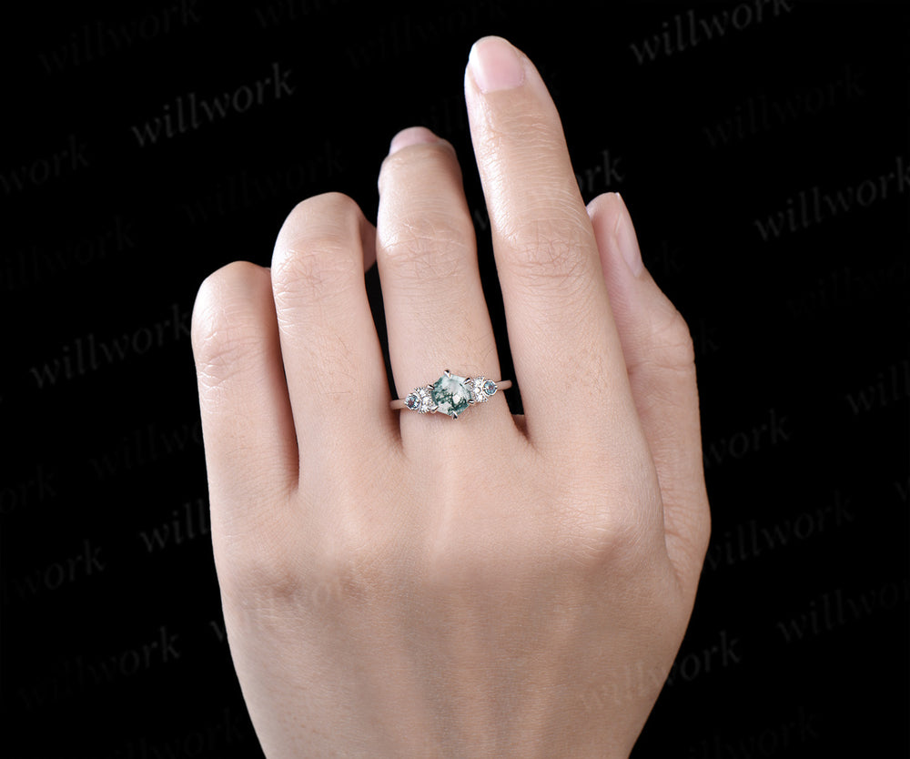 ***A hexagon-cut moss agate glows like a forest gemstone at the heart of this dreamy engagement ring, cradled by shimmering moon-shaped diamonds and mystical color-shifting alexandrites. Each facet dances with light, mirroring the magic of nature and celestial elegance.***- Metal: Solid gold(10K/14K/18K white/yellow/rose gold),925 sterling silver,platinum available