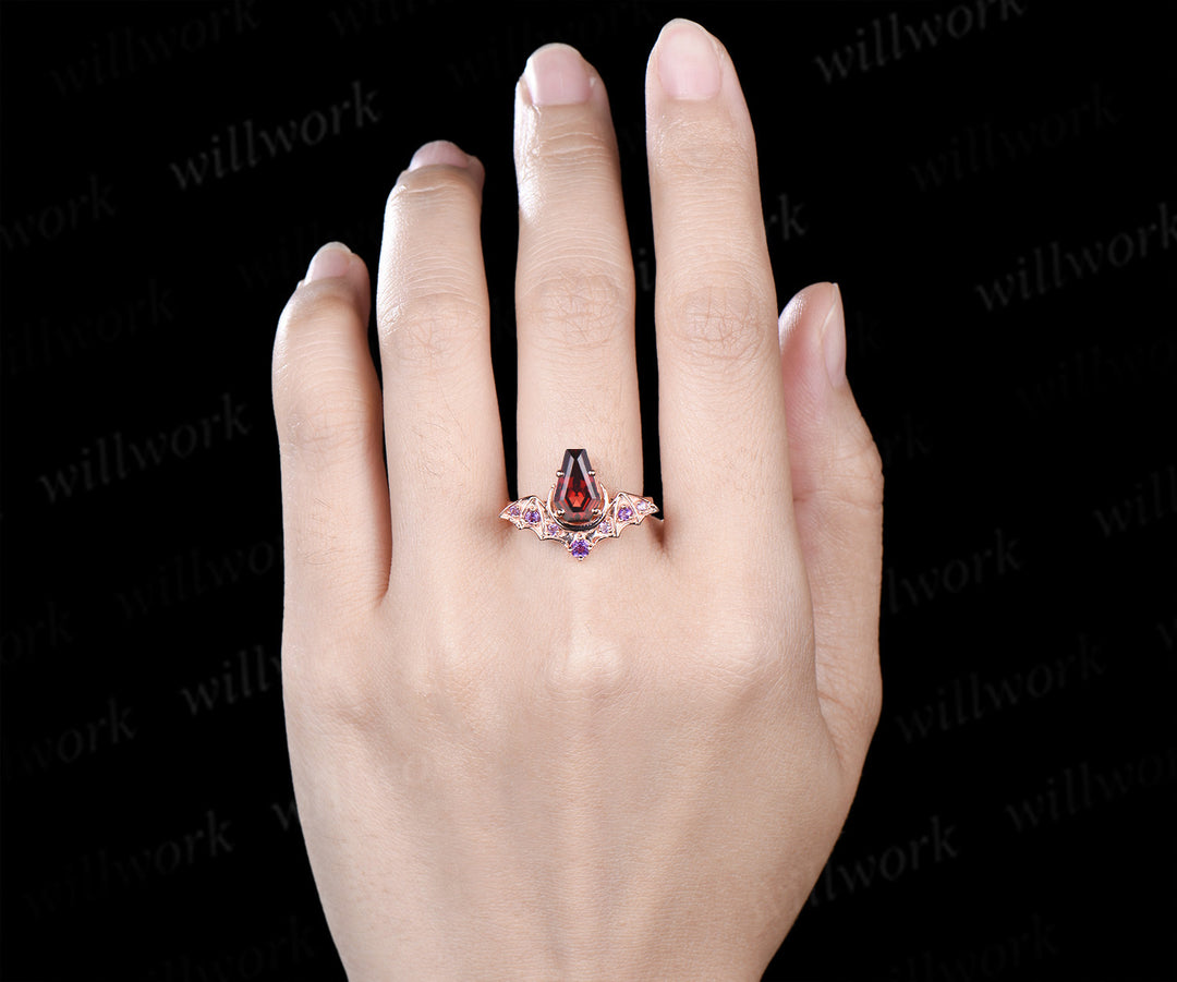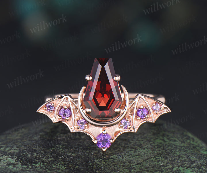 Kite coffin red garnet ring rose gold bat moon wing engagement ring amethyst wedding ring