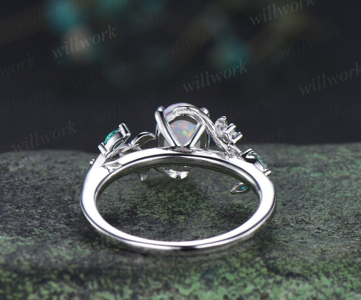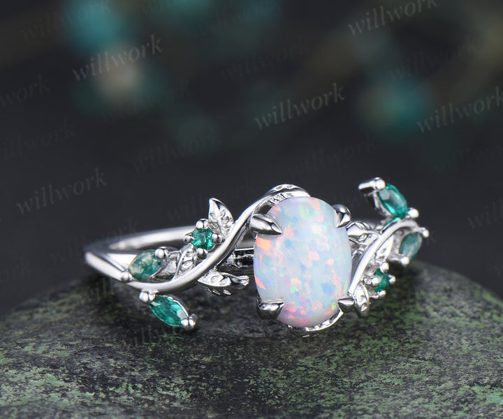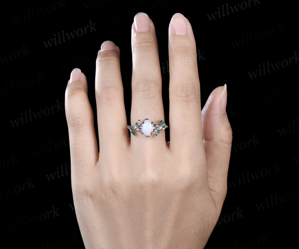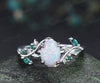 Oval white opal engagement ring retro emreald moss agate leaf branch ring nature inspired bridal ring gifts for women