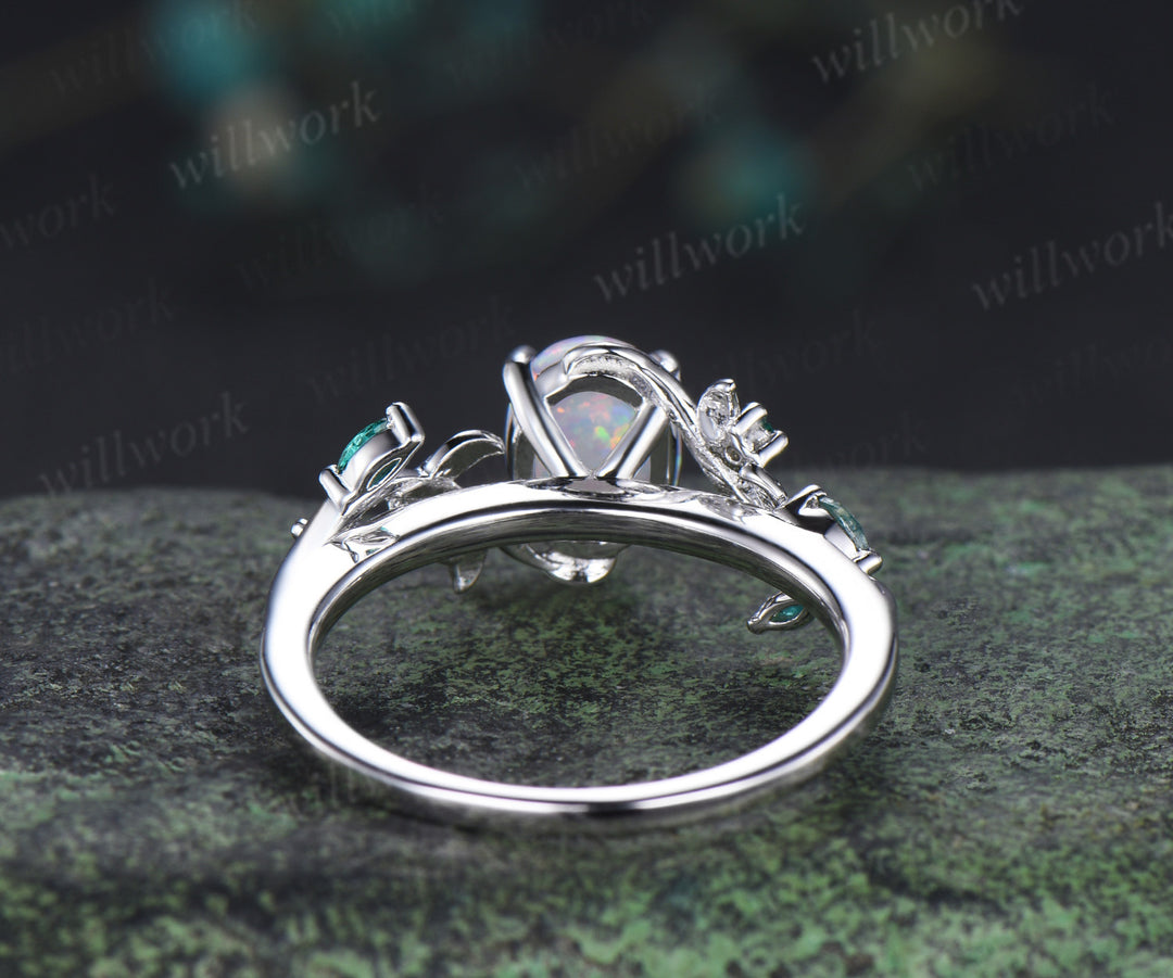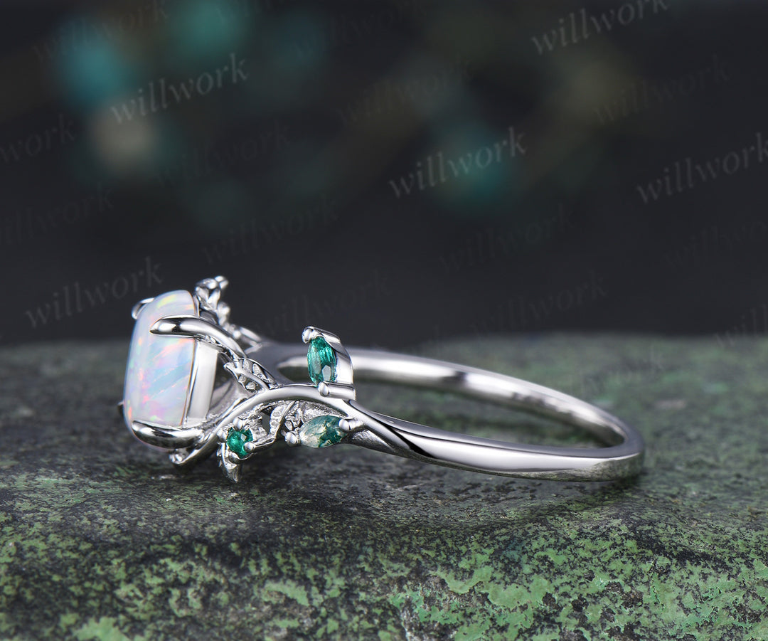 ***An oval white opal shimmers with iridescent glow, paired with emeralds and moss agate accents and delicate leaf-branch details. Nature-inspired and timeless, the bridal ring captures elegance and individuality, making it a meaningful engagement ring or a perfect gift for women.***- Metal: Solid gold(10K/14K/18K white/yellow/rose gold),925 sterling silver,platinum available