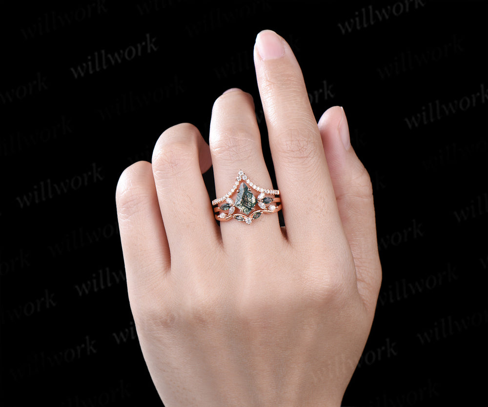 ***This captivating engagement ring set showcases a striking kite-cut moss agate, its intricate green inclusions evoking the beauty of a hidden forest. Framed by a delicate marquise cluster and accentuated with shimmering diamonds.***- Metal: Solid gold(10K/14K/18K white/yellow/rose gold),925 sterling silver,platinum available