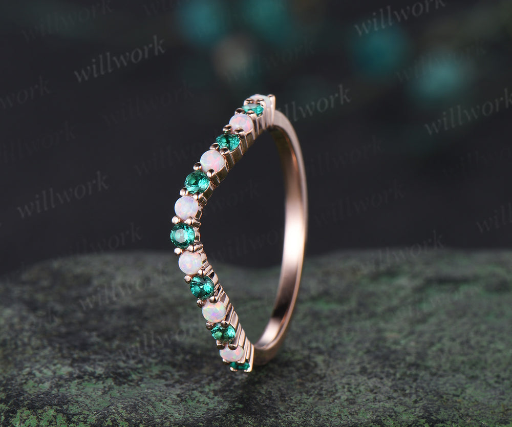 Curved opal emerald wedding band solid 14k rose gold Multi-Stone rings stacking bridal anniversary ring women gift