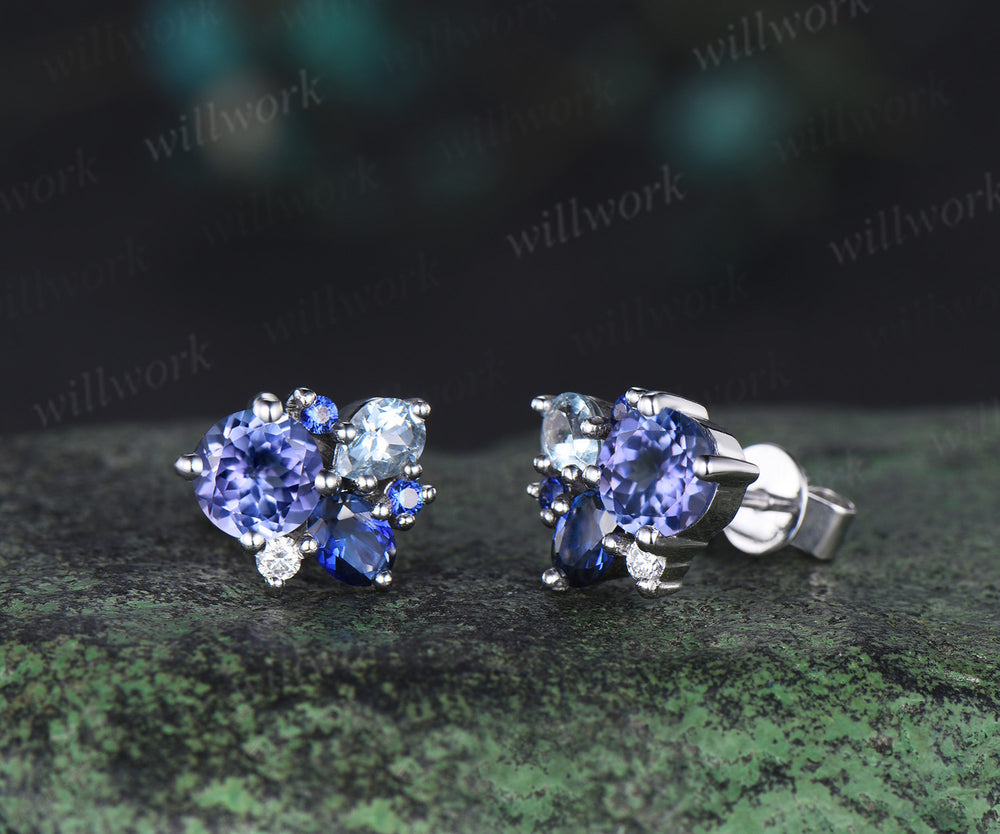 Dainty Round Cut Natural Tanzanite Stud Earrings 14K white Gold Blue Sapphire Aquamarine Cluster Multi-Stone Earrings December Birthstone Earrings