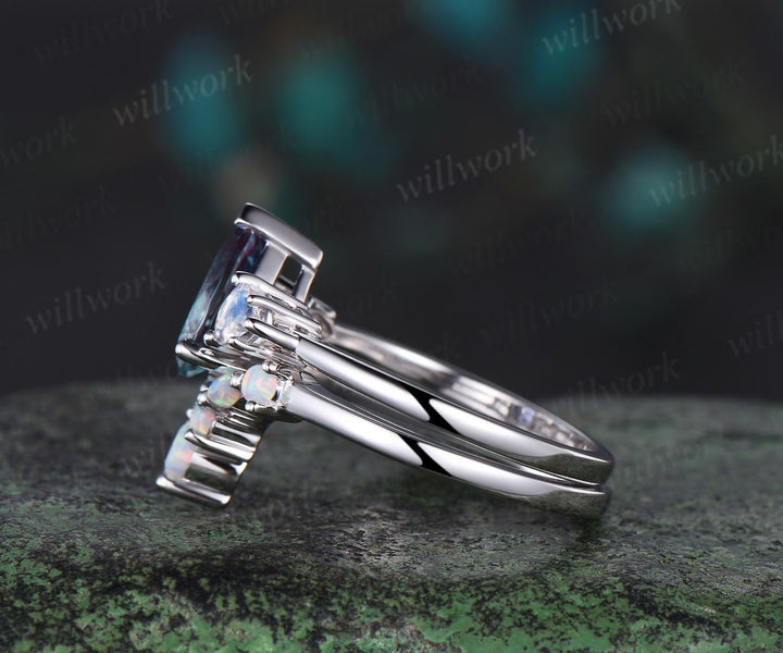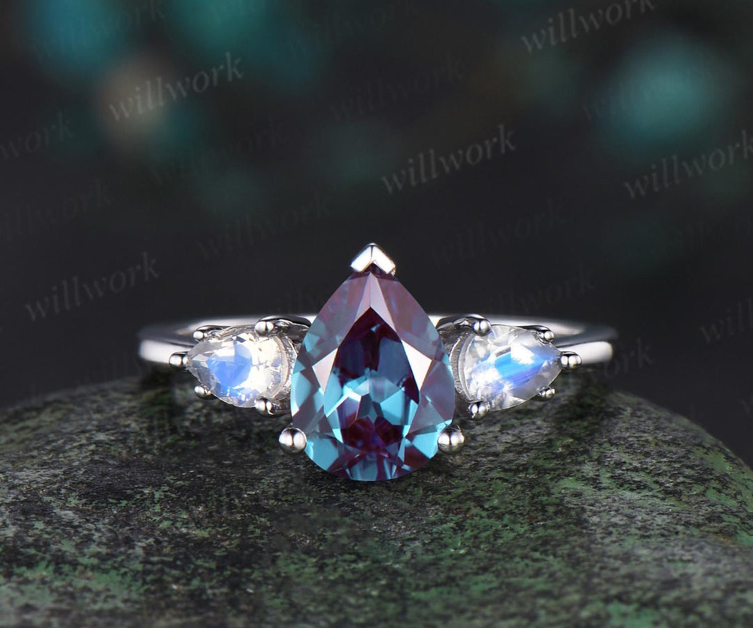 Pear shaped alexandrite moonstone ring white gold three stone unique engagement ring set stacking opal ring women color change gemstone gift