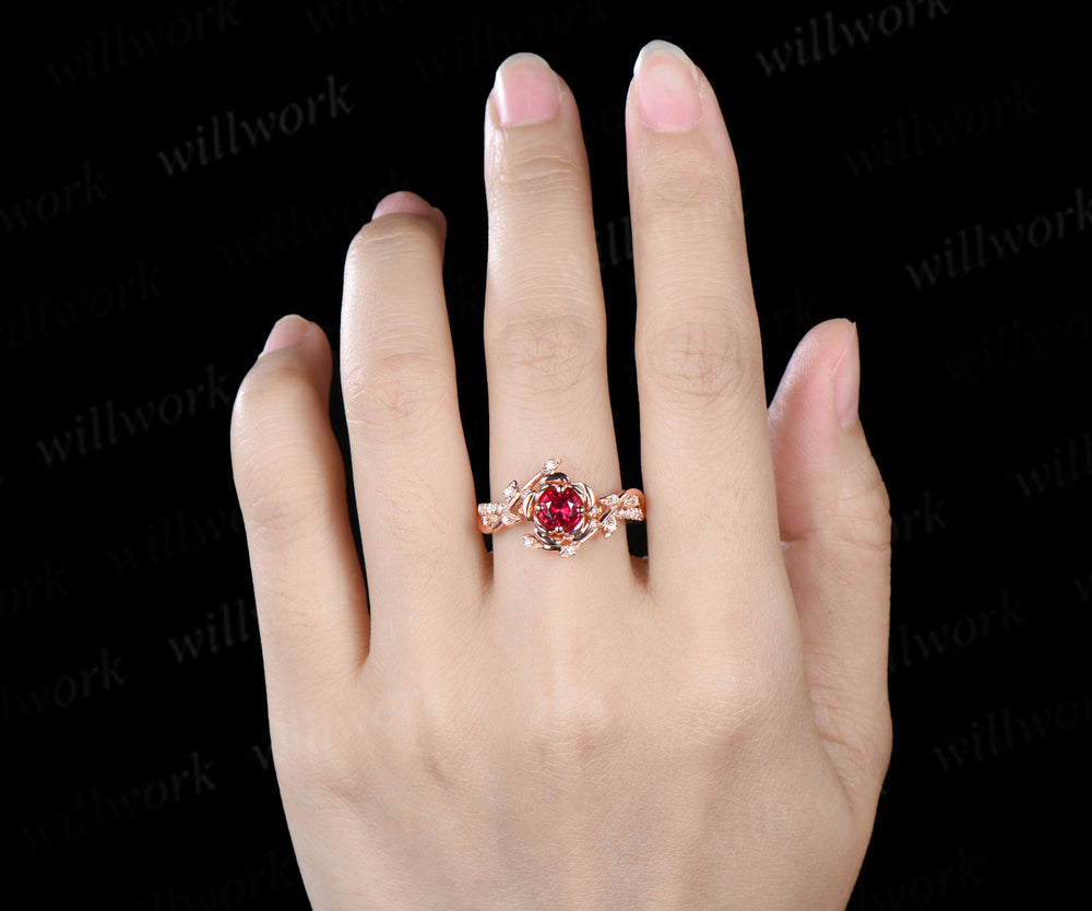 5mm round ruby floral engagement ring twig leaf diamond nature inspired ring half eternity band promise anniversary gifts