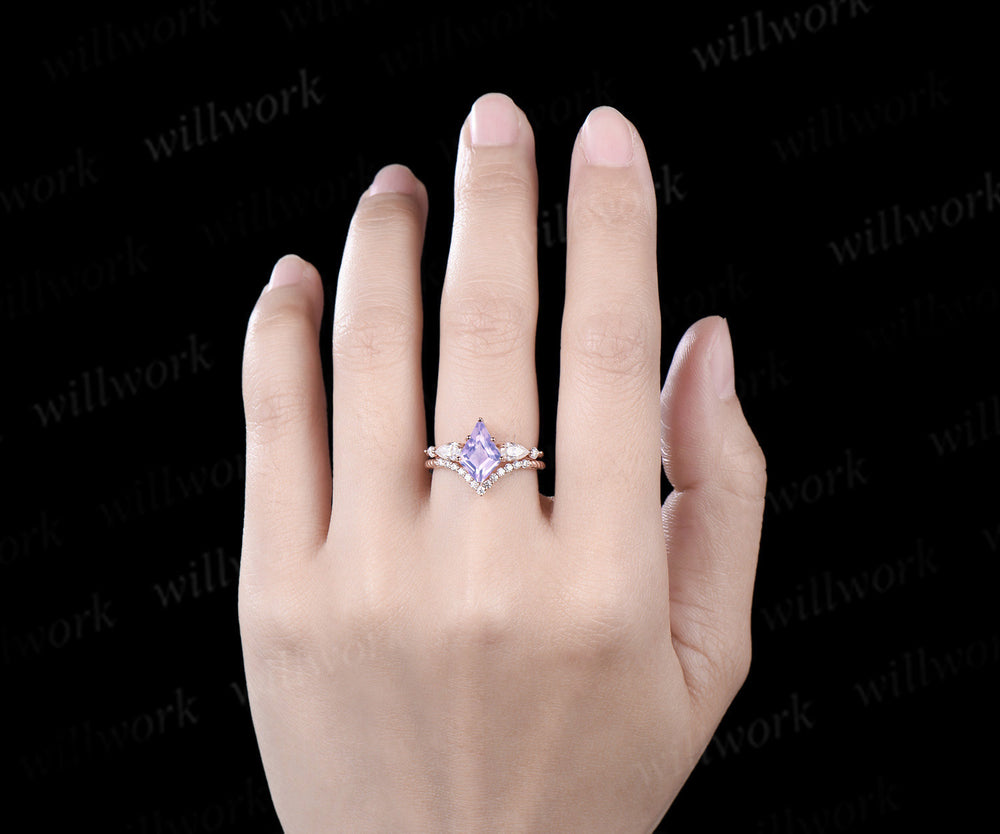 Kite cut Lavender Amethyst engagement ring rose gold 6 prong five stone pear diamond ring vintage promise bridal ring set women
