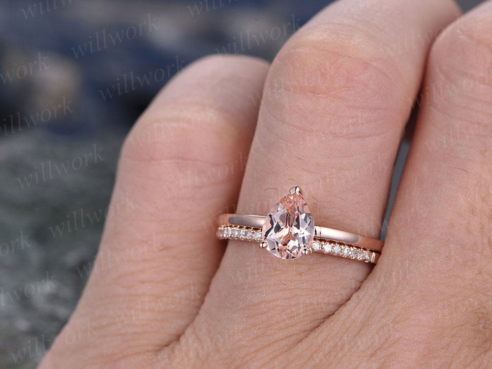 Morganite engagement ring set-handmade Solid 14k Rose gold ring-Real Pave Diamond band-6x8mm Tear Dropped cut promise ring-Bridal Ring set
