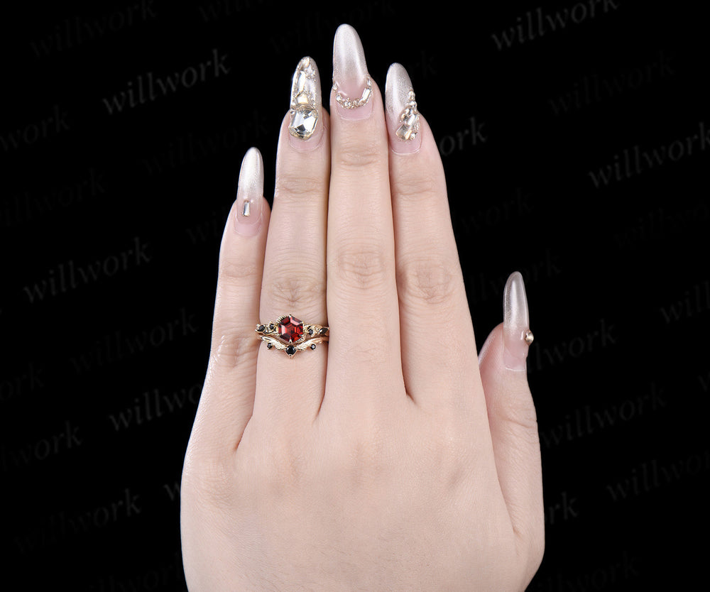 Vintage hexagon cut red garnet engagement ring set yellow gold leaf nature inspired five stone black spinel ring women