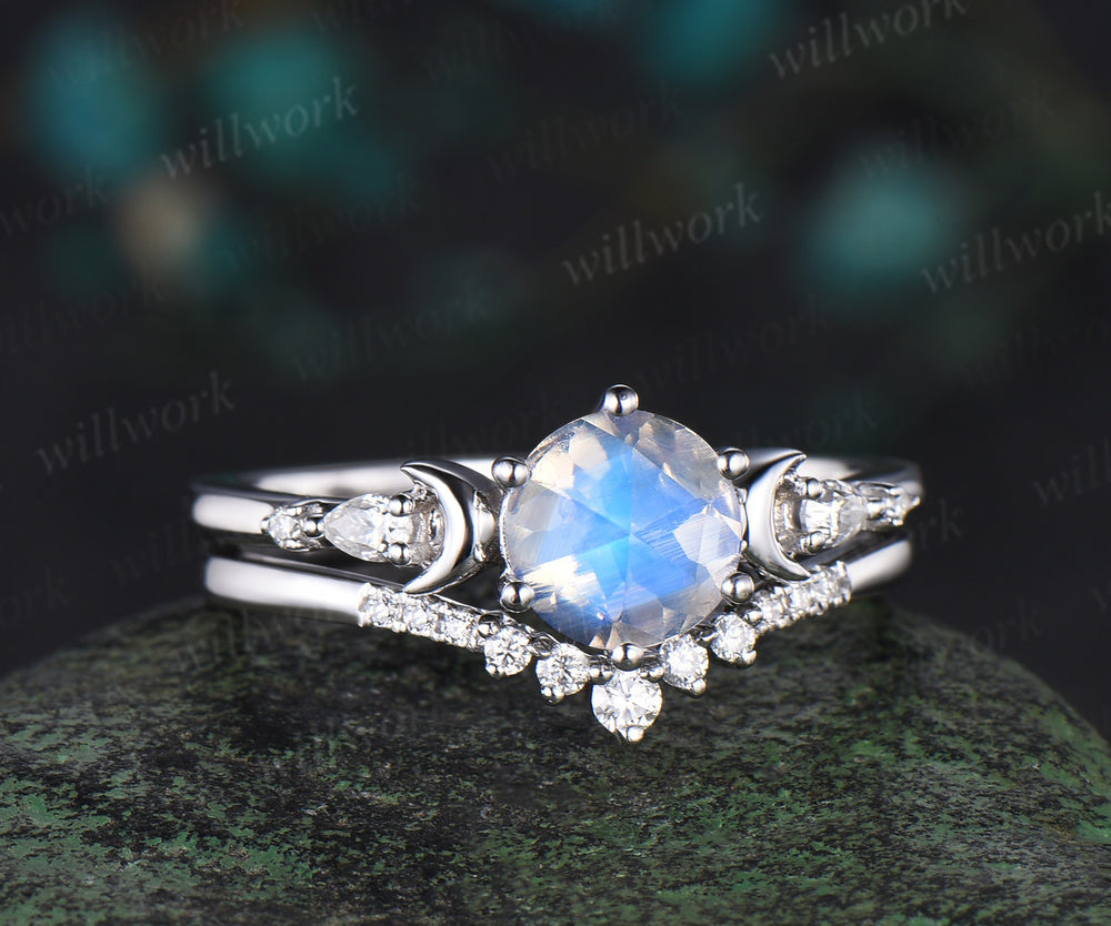 Round rose cut moonstone engagement ring set 14k white gold five stone moon diamond stacking wedding anniversary ring women