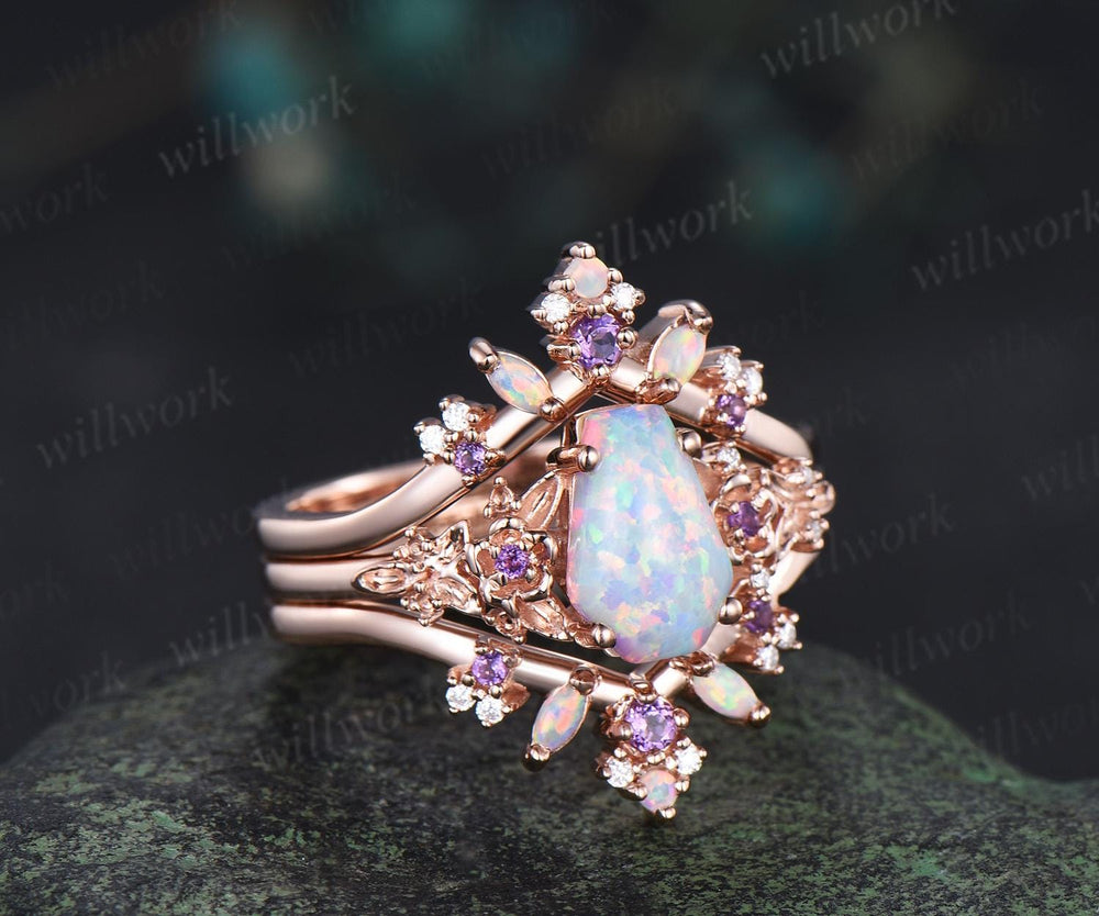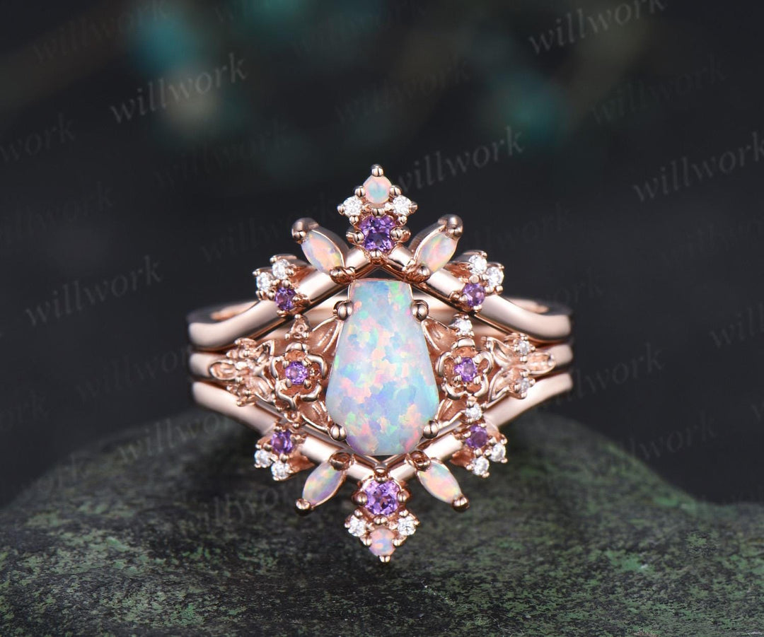 Kite cut amethyst ring minimalist vintage white gold three stone unique engagement ring set women stacking opal bridal set gift jewelry
