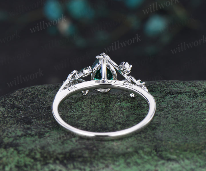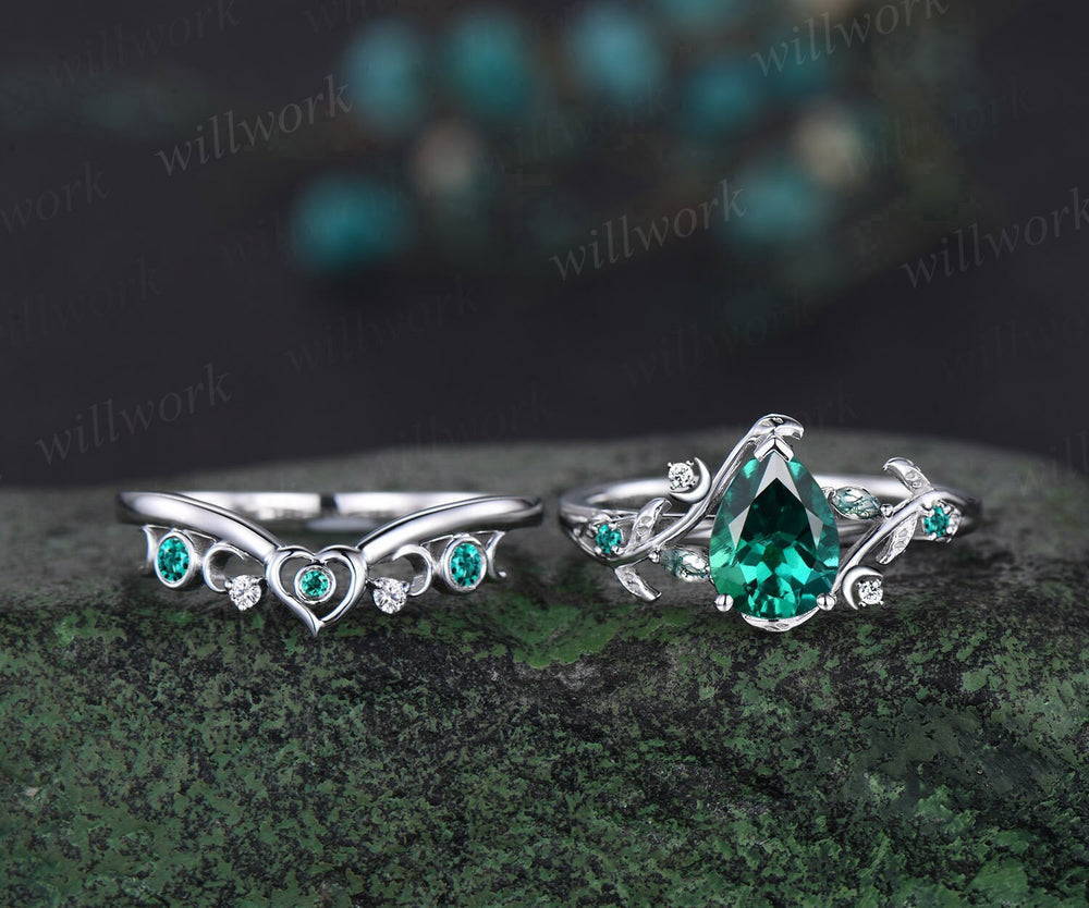 Pear shaped green emerald engagement ring white gold heart leaf moon nature inspired emerald bridal wedding ring set women jewelry gift