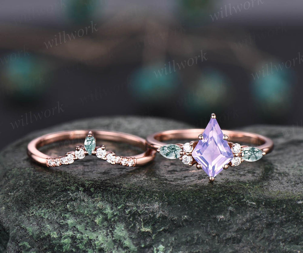 Kite cut Lavender Amethyst ring rose gold 6 prong art deco unique engagement ring set women dainty diamond ring moss agate anniversary gift