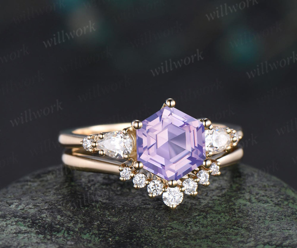 Unique hexagon cut Lavender Amethyst engagement ring set five stone moissanite yellow gold ring women matching wedding ring her gift