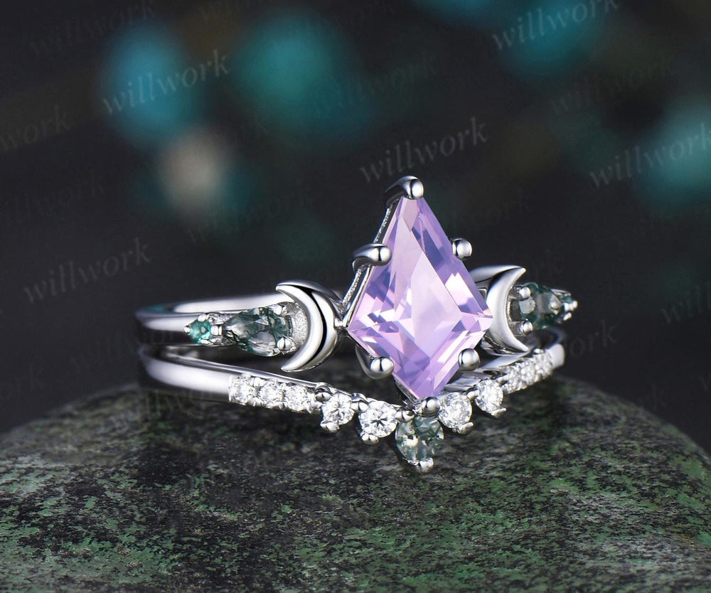 Unique kite cut Lavender Amethyst engagement ring set women white gold gold moss agate five stone moon bridal ring set gift for women