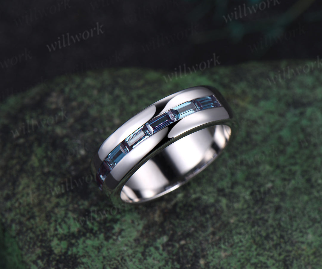 Baguette cut alexandrite wedding band men half eternity mens wedding ring band June birthstone ring anniversary gift