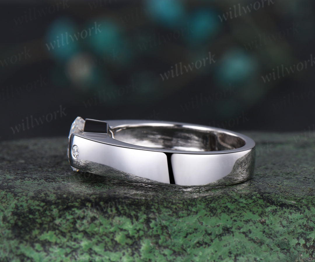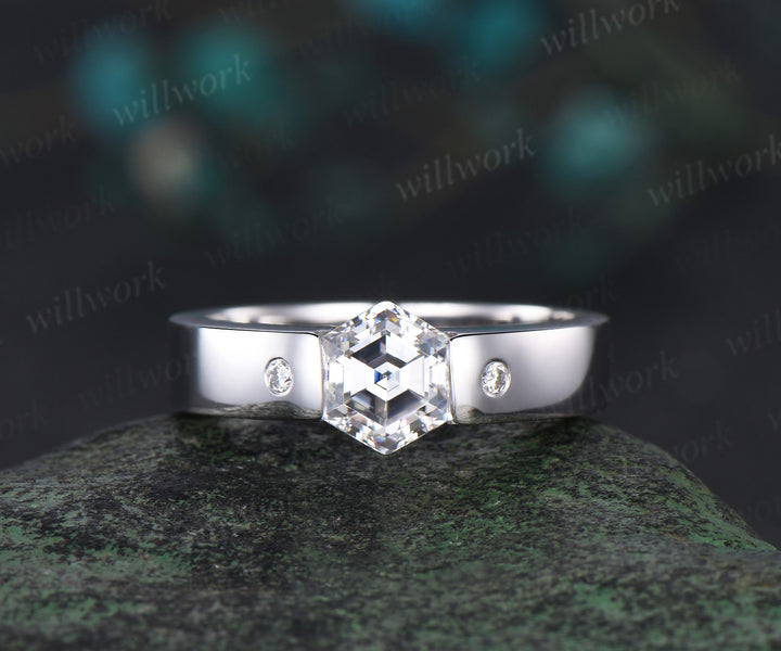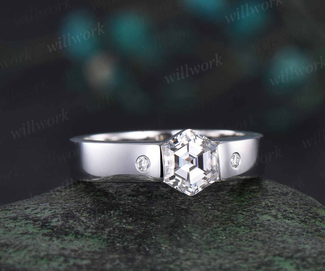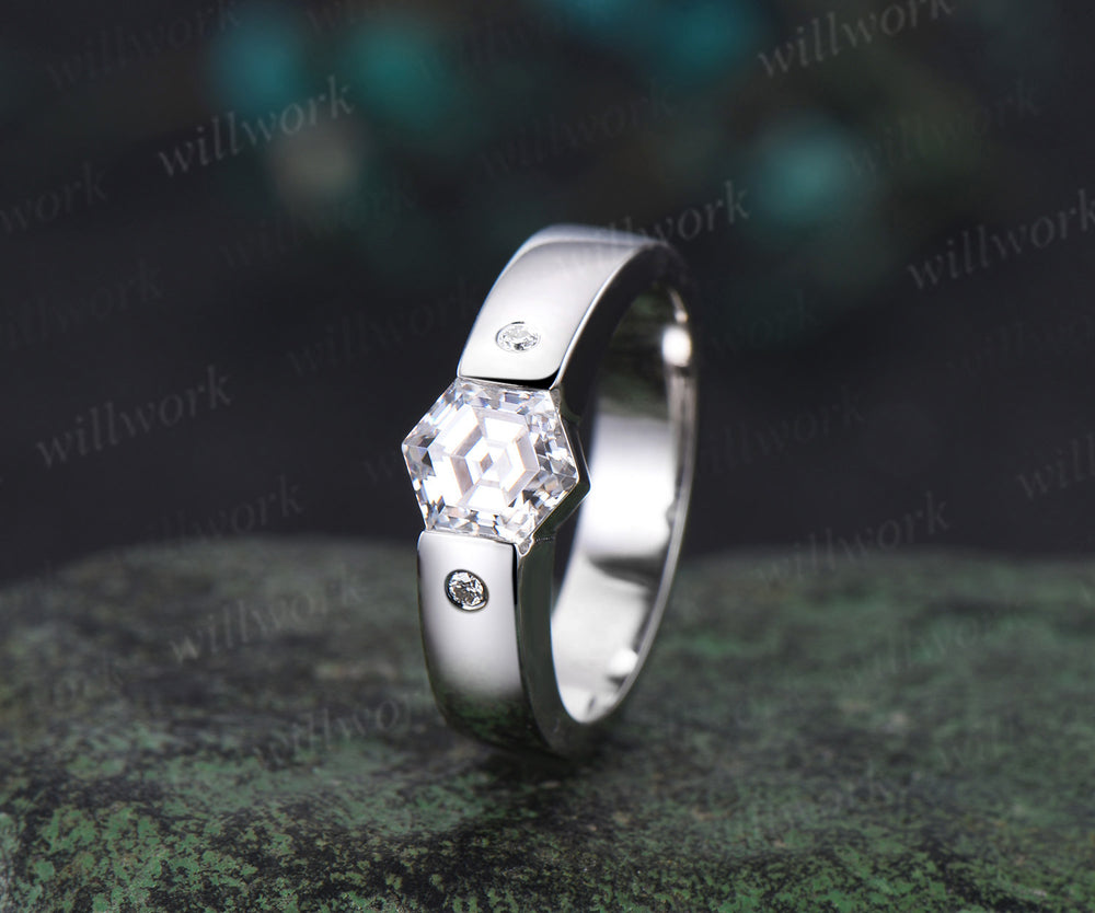 Hexagon cut moissanite wedding band men three stone diamond mens wedding ring band unique engagement anniversary gift