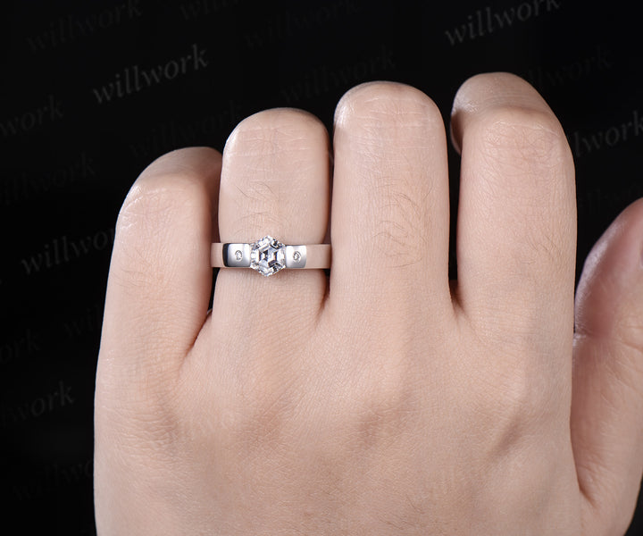 - Main Stone: 6mm Hexagon cut moissanite.