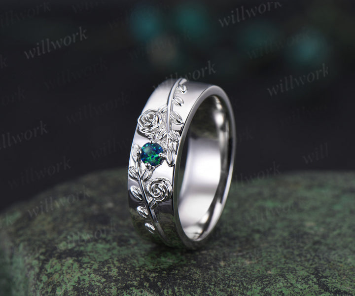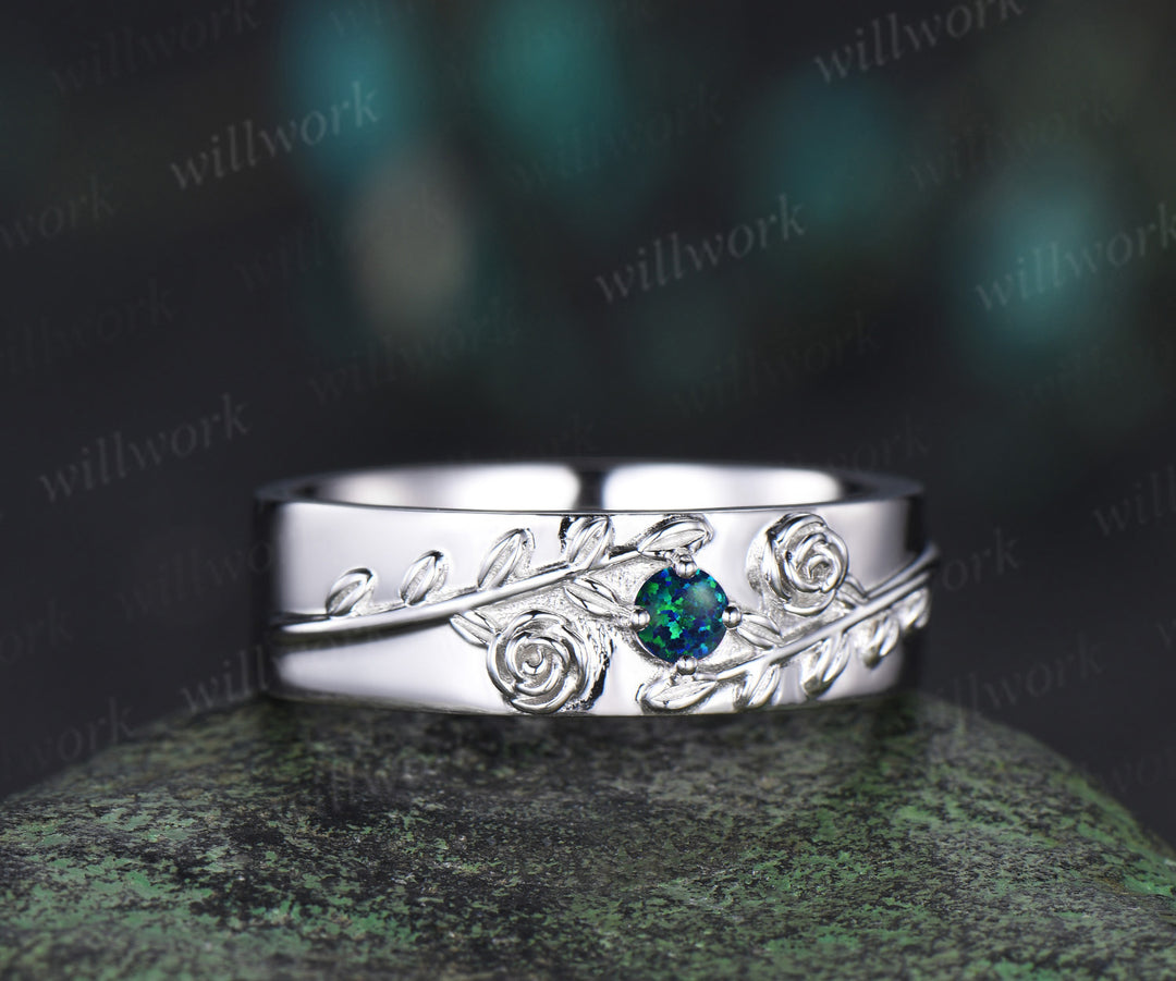 Round black opal mens wedding band solid 14k white gold leaf floral wedding ring unique anniversary ring gift nature inspired Engagement Ring