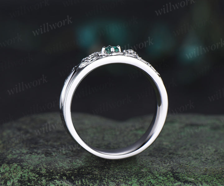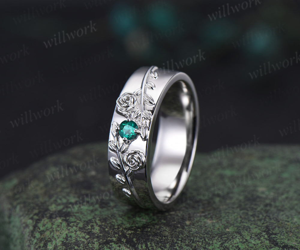 Round green emerald mens wedding band solid 14k white gold leaf floral wedding ring unique anniversary ring gift nature inspired Engagement Ring