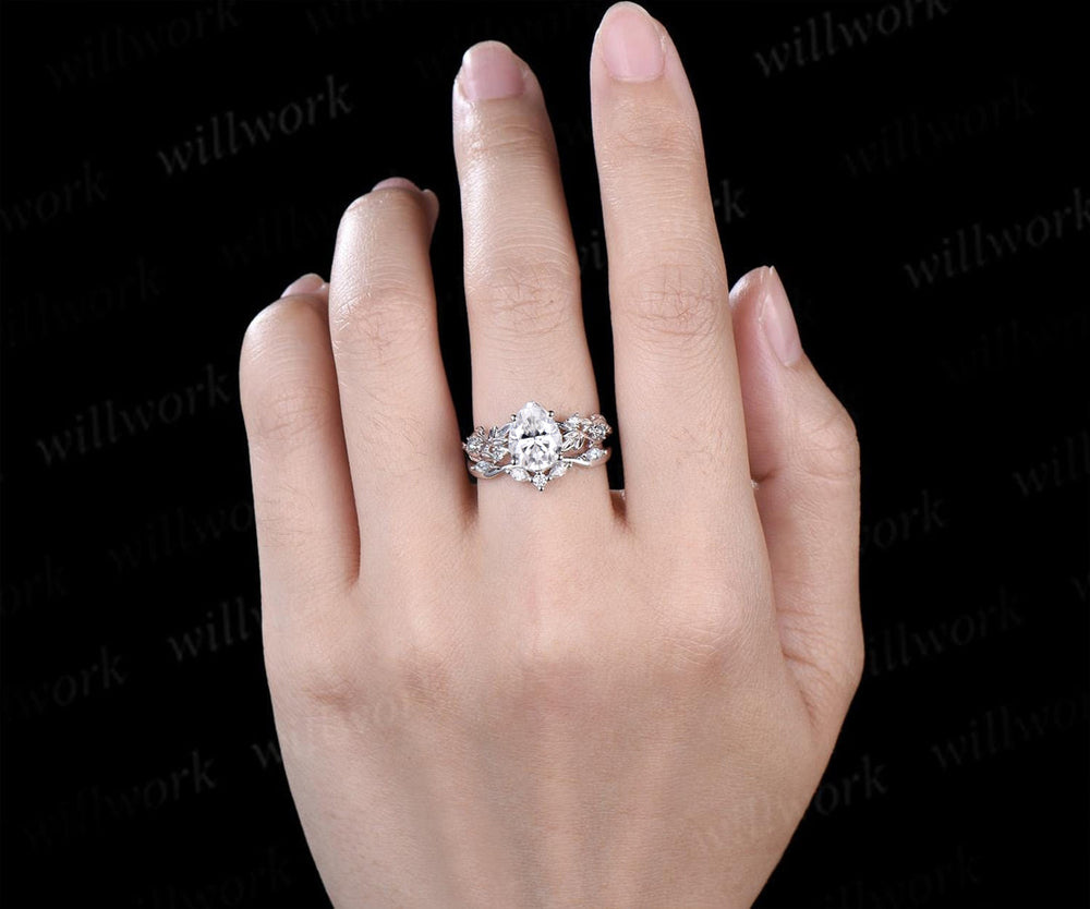 Pear shaped moissanite ring leaf infinity nature inspired engagement ring set 18k white gold aquamarine promise wedding ring set jewelry Pear shaped moissanite ring leaf infinity nature inspired engagement ring set 18k white gold aquamarine promise wedding ring set jewelry $396.00