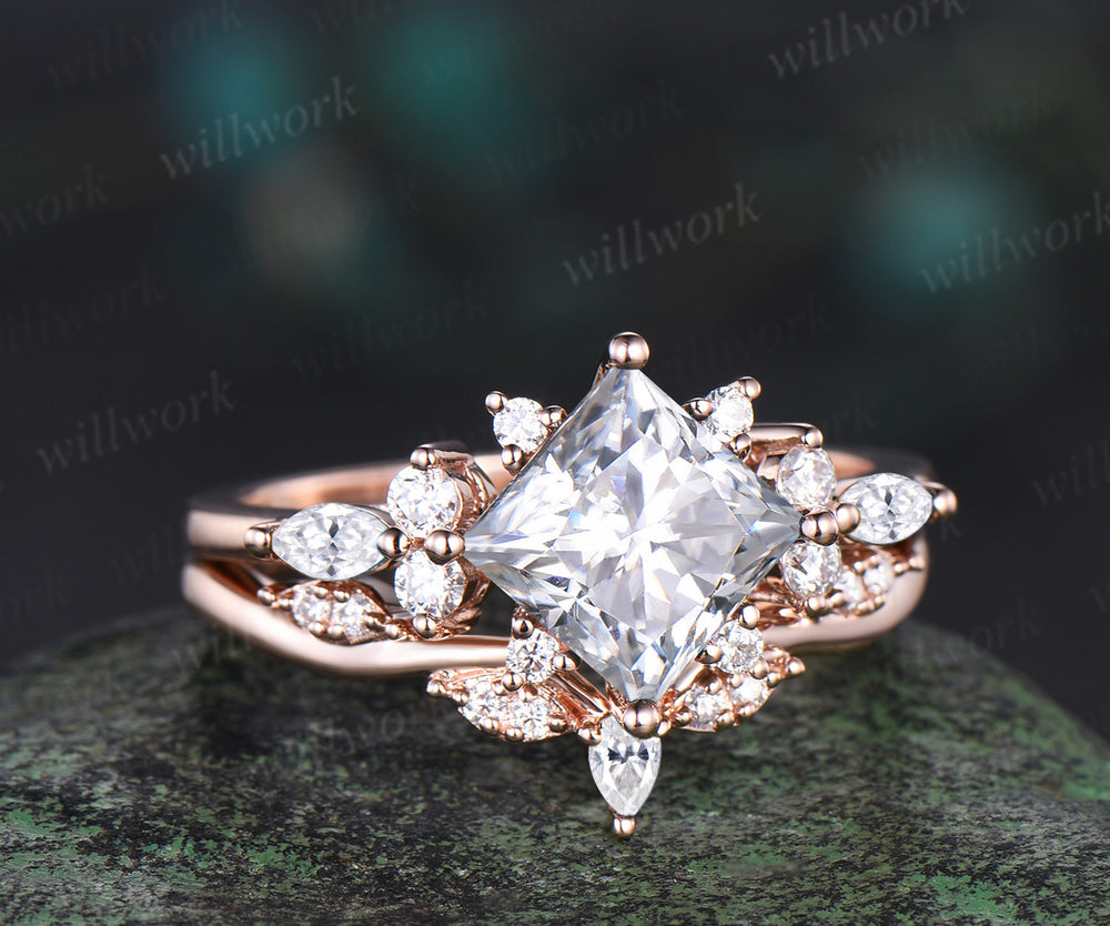 Pincess cut moissanite engagement ring set cluster diamond 14k rose gold ring women stacking unique promise wedding ring set