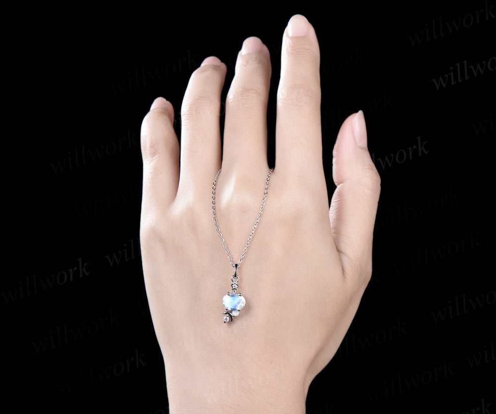 East to West oval moonstone necklace celestial moon star diamond opal elegant pendant necklace June birthstone anniversary gifts
