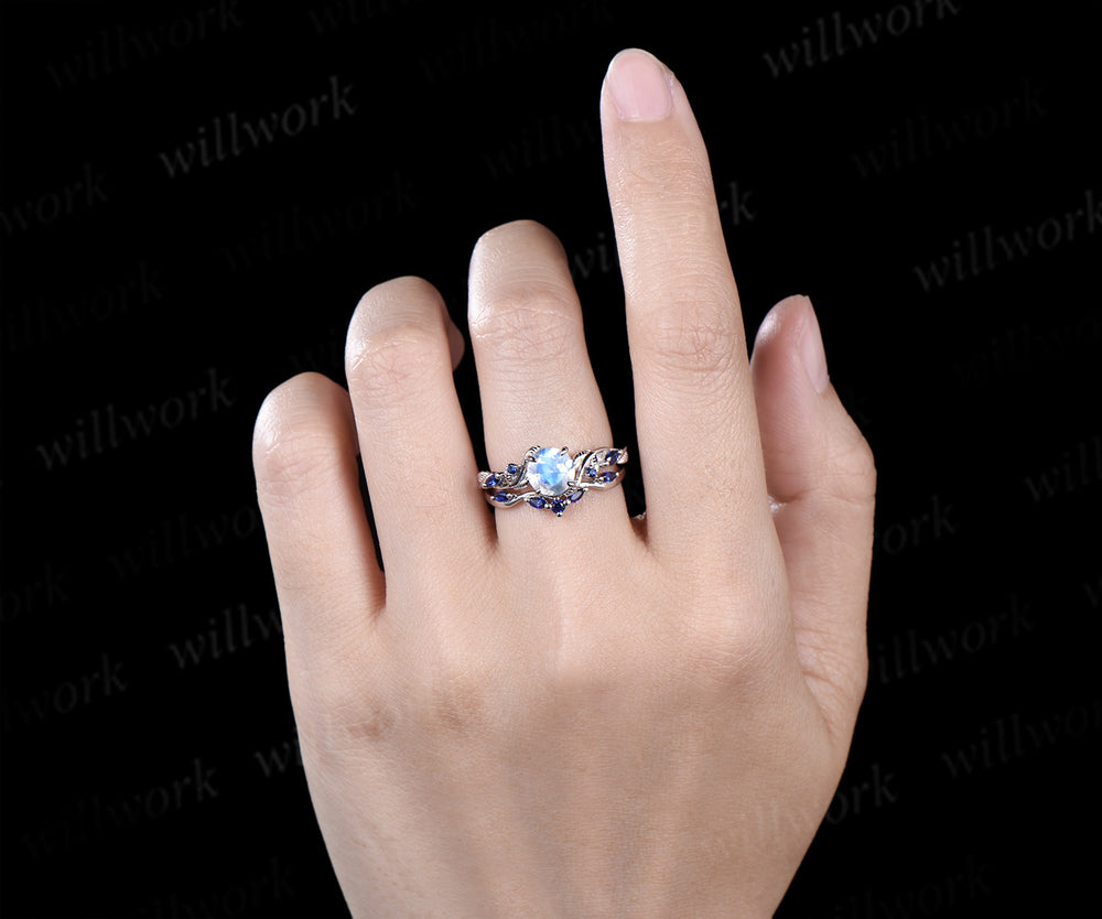 Round cut nature inspired moonstone engagement ring set unique leaf design ring blue sapphire wedding band birthstone anniversary gifts