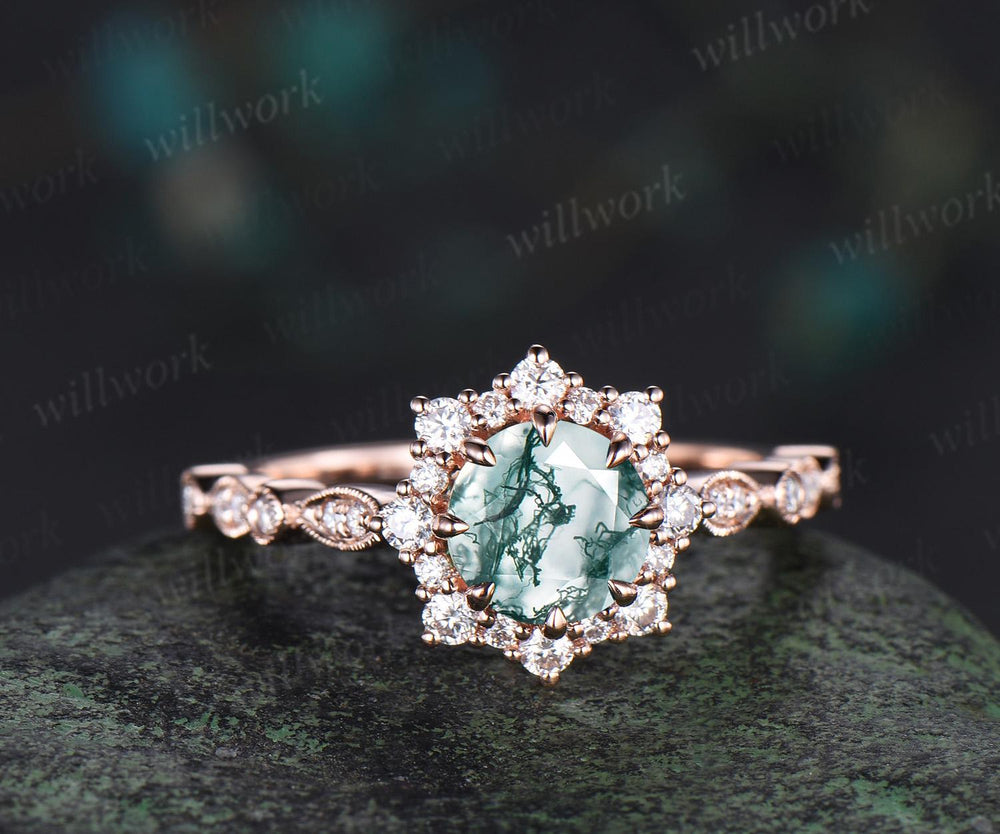 1ct round cut green moss agate engagement ring solid 14k rose gold halo snowdrift milgrain diamond promise ring unique wedding ring women