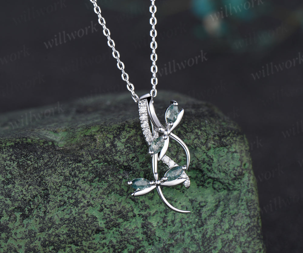 Elegant moss agate necklace pendant double dragonfly necklace silver white gold green agate pendant marquise agate handmade proposal gifts