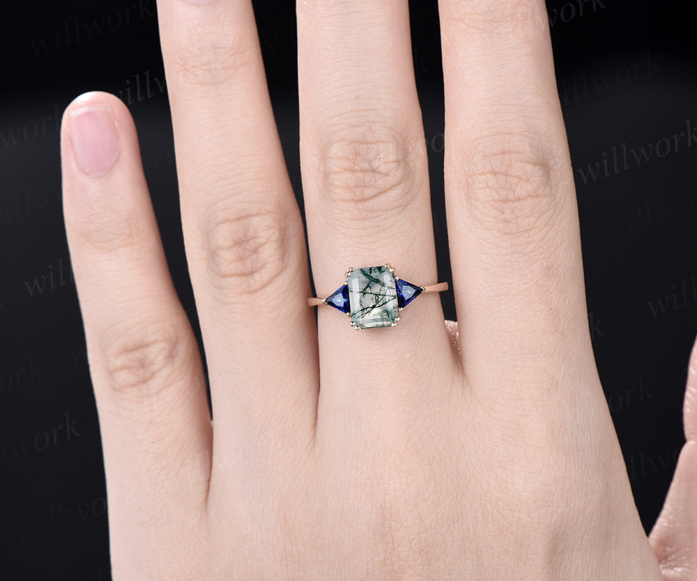 Emerald cut green moss agate ring 14k yellow gold Trilliant sapphire ring three stone unique engagement ring Minimalist wedding ring women