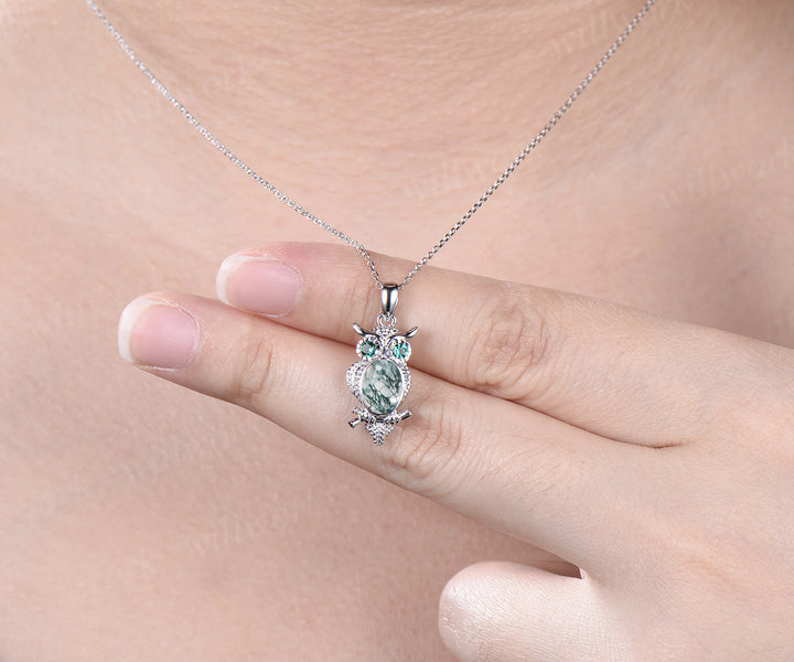 Unique Owl Moss Agate Necklace Personalized Pendant Necklace 14k 18k White Gold Emerald Pendant Night Owl Animal Inspired Promise Gift