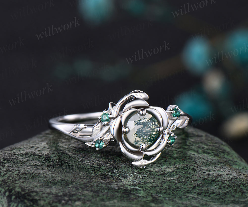 Unique Round Cut Ring Vine Wrapped Moss Agate Ring 14k White Gold Engagement Ring Floral ring Anniversary Gift Ring