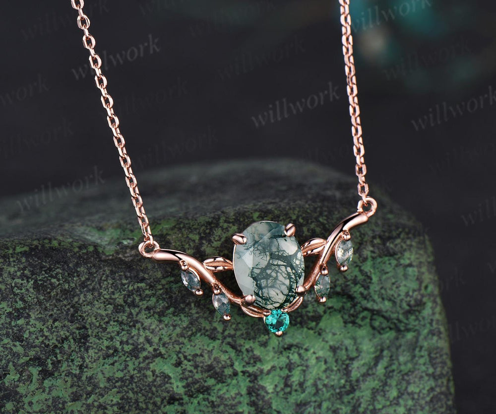 2ct oval cut natural moss agate necklace solid 14k rose gold leaf nature inspired emerald pendant women gift mother