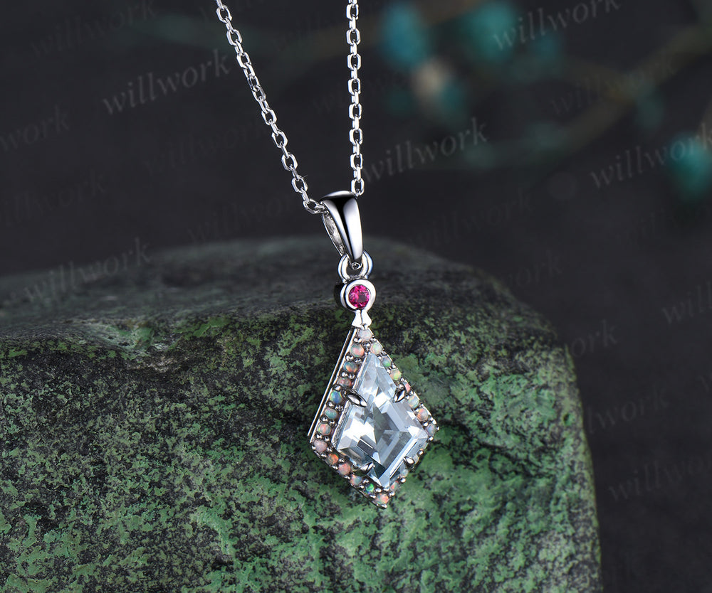 Kite cut aquamarine opal halo pendant necklace ruby accent pendant March birthstone jewelry mother anniversary gifts