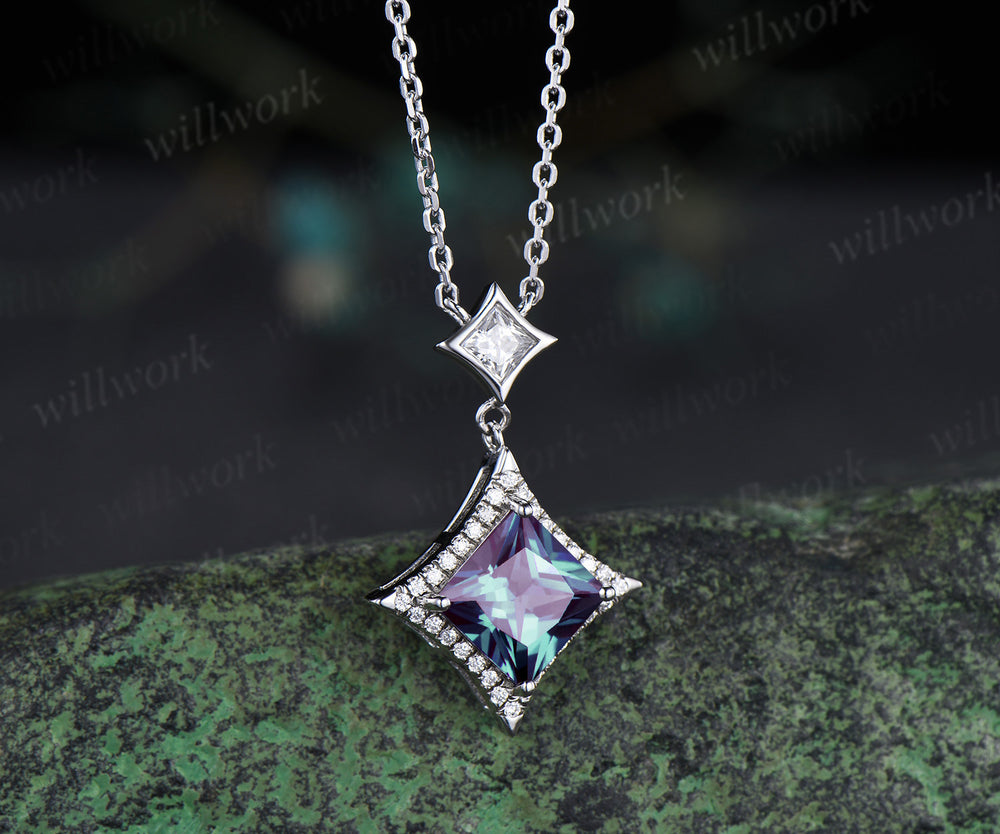 Princess Cut alexandrite diamond Halo Pendant Necklace Solid 14k White Gold Square Shape Drop Necklace