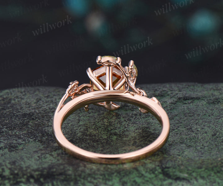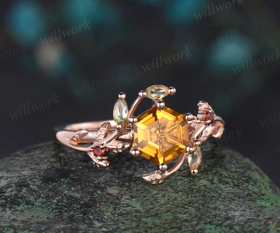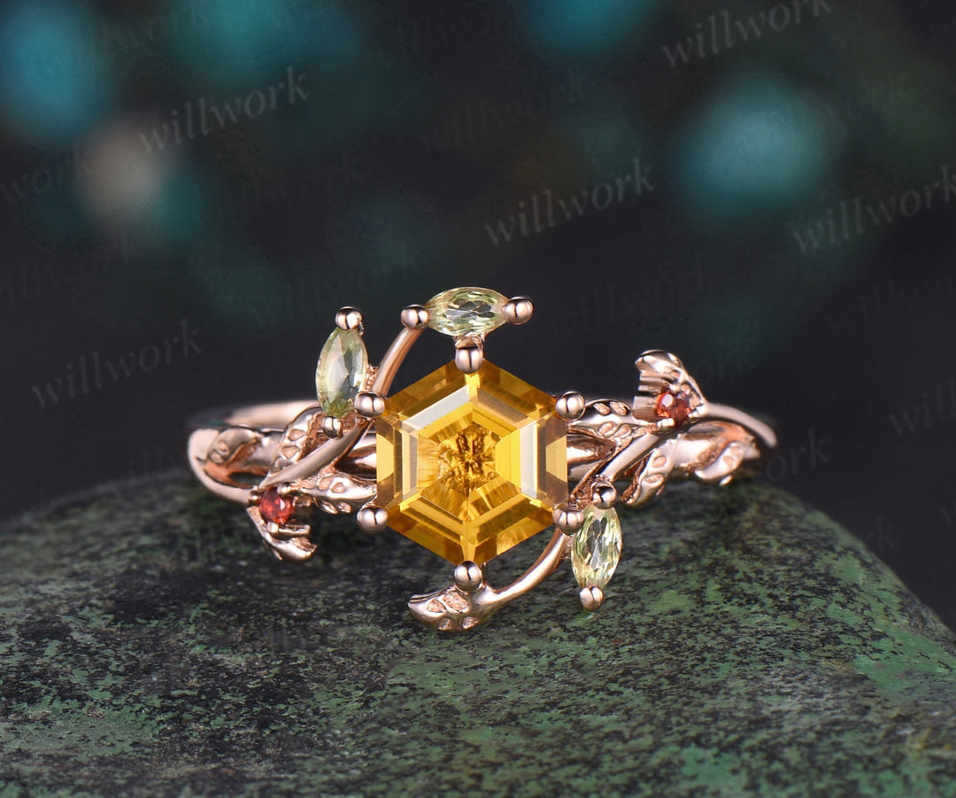 Hexagon cut yellow citrine engagement ring rose gold leaf 6 prong peridot garnet bridal anniversary ring women