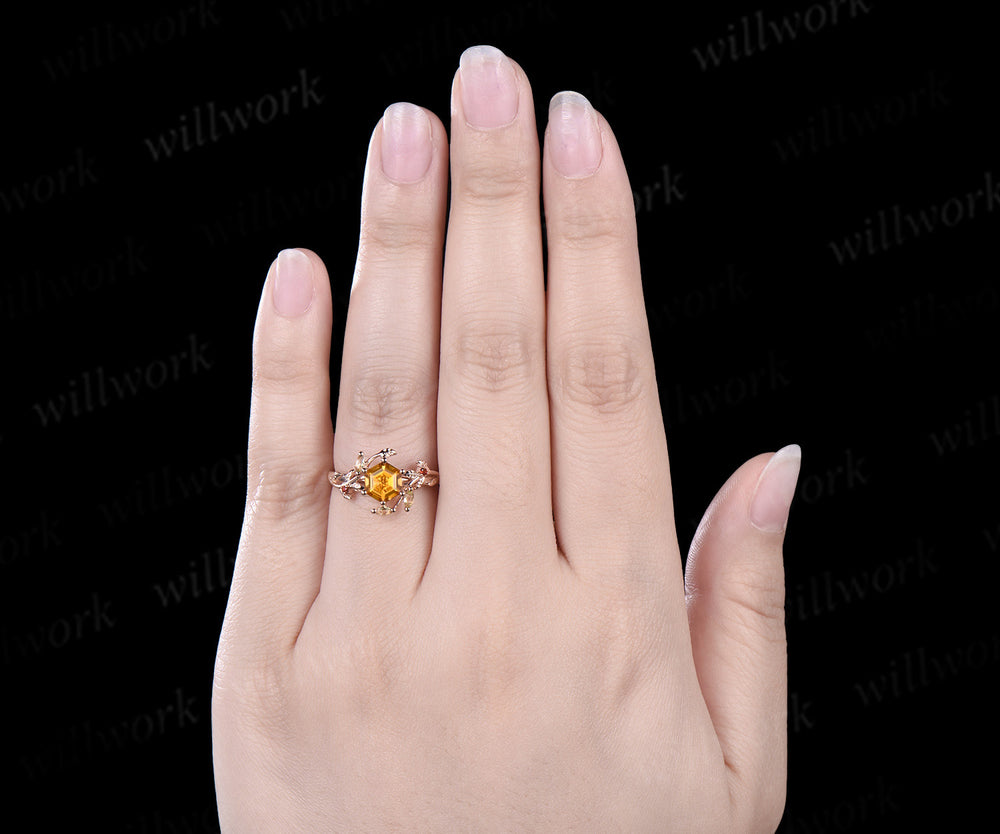 Hexagon cut yellow citrine engagement ring rose gold leaf 6 prong peridot garnet bridal anniversary ring women Hexagon cut yellow citrine engagement ring rose gold leaf 6 prong peridot garnet bridal anniversary ring women $407.00