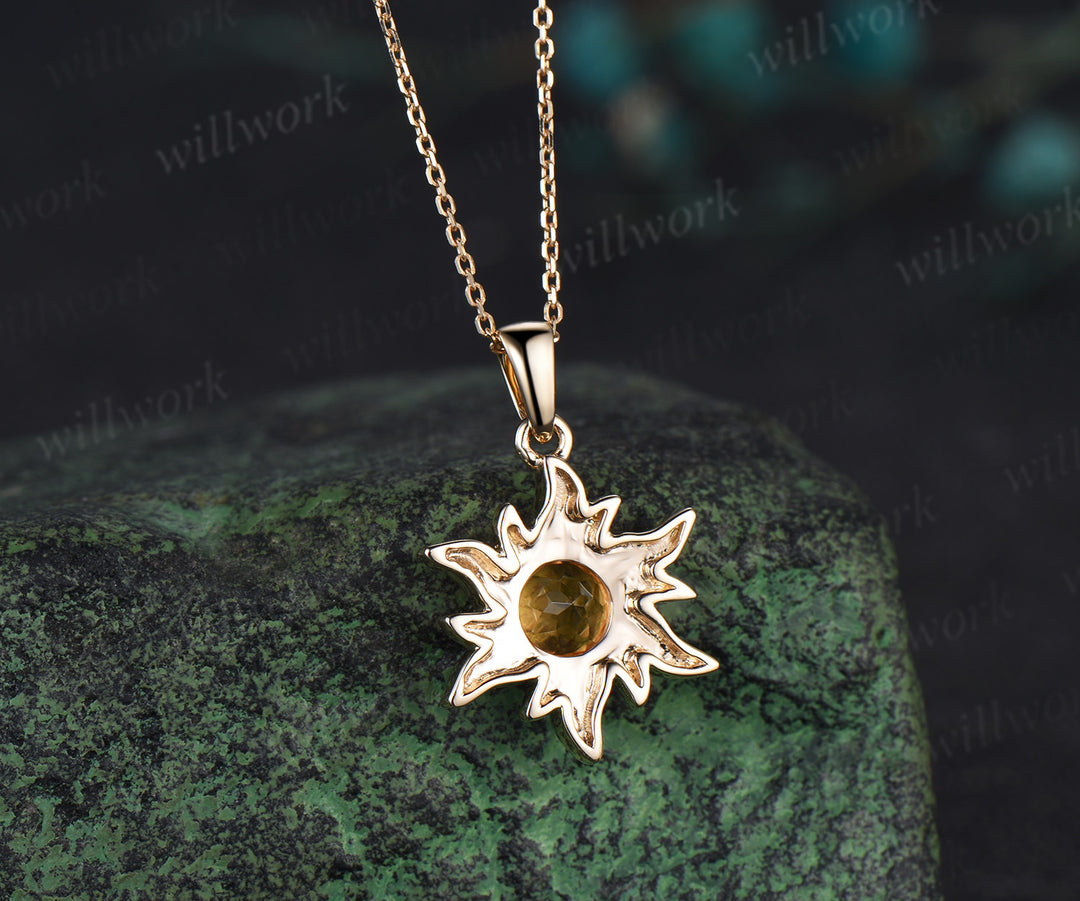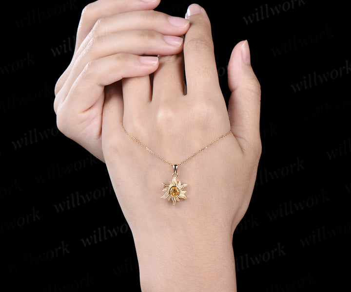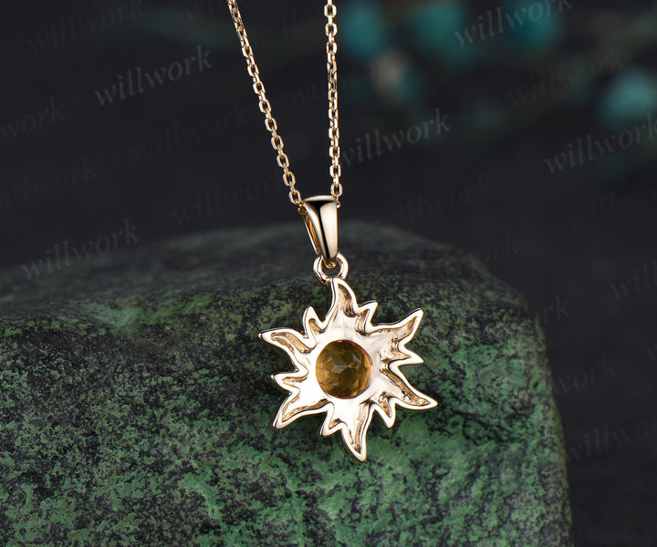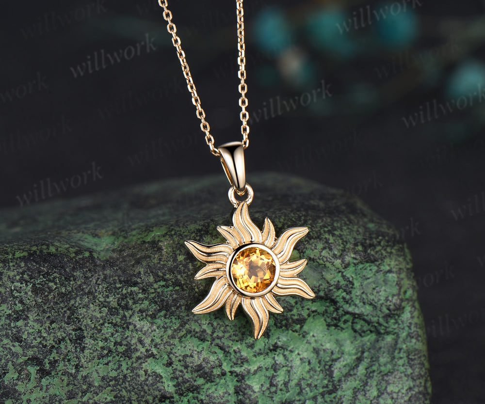 Minimalist Round Cut Citrine Sun Necklace Unique 14k Rose Gold Yellow Crystal Solitaire Pendant Dainty November Birthstone Necklace