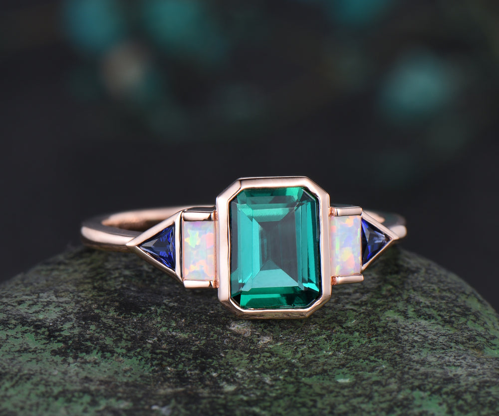 Bezel emerald cut green emerald engagement ring rose gold five stone Baguette opal ring Trilliant sapphire ring retro unique anniversary gift